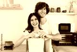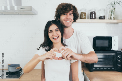 Happy young couple in love have fun in st valentines day Valentine Young Couple Making Shape Heart by their Hands looking at camera Girlfriend and boyfriend or Wife and husband stay together at house