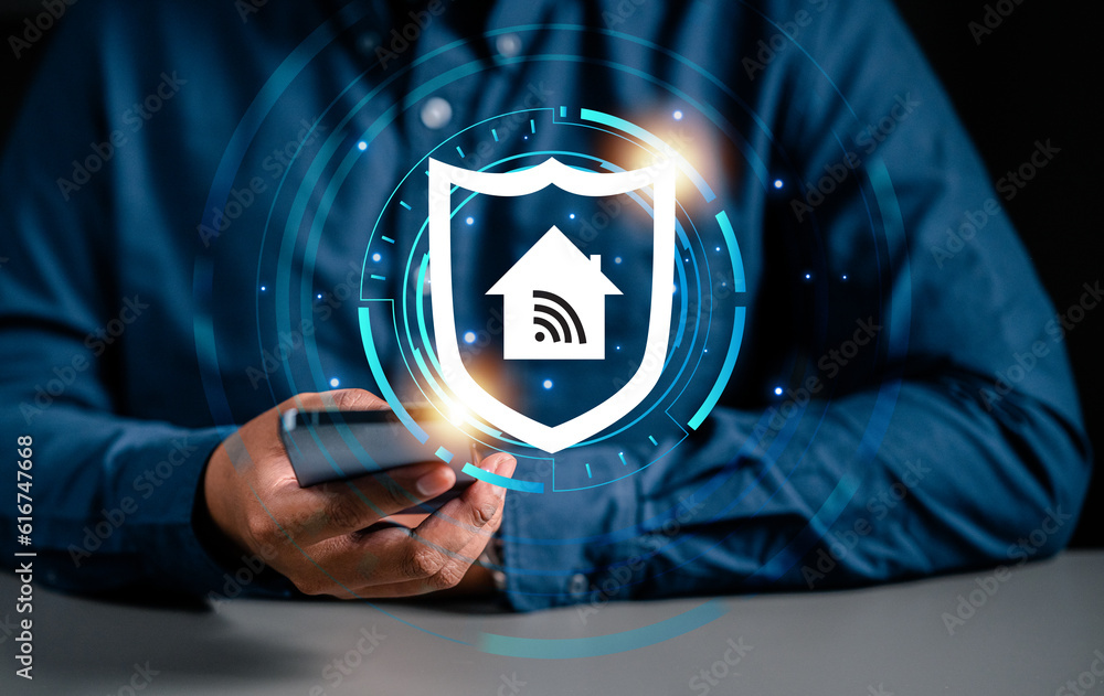 technology, smart home, internet, screen, control, innovation, iot, smart, assistant, business. touching smartphone to check smart home of protection controller. iot shield icon is showing for support