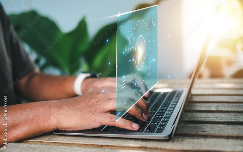 technology, multimedia, laptop, information, security, privacy, business, sharing, protection, media. typing keyboard to use multimedia technology. thumbnail system laptop information hud is showing.