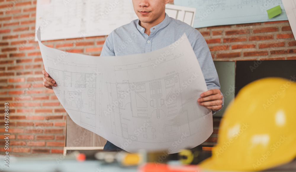blueprint, plan, architect, project, engineer, meeting, brainstorming, teamwork, team, paperwork. engineer look at blueprint to checking process and structure for building constructor. architecture.