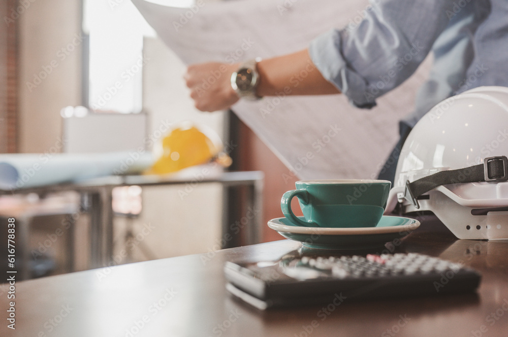 blueprint, plan, architect, project, engineer, meeting, brainstorming, teamwork, team, paperwork. engineer look at blueprint to checking architecture and structure for building constructor project.