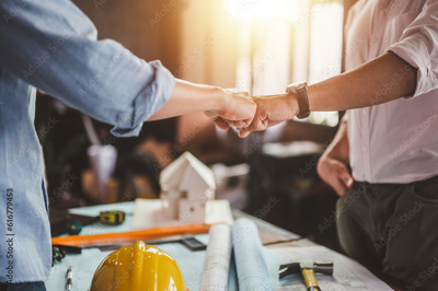 blueprint, plan, architect, project, engineer, meeting, brainstorming, teamwork, team, discussion. engineer and foreman fist bump for meet and brainstorm to prepare blueprint architect build project.