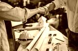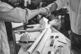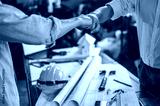 blueprint, plan, architect, project, engineer, meeting, brainstorming, teamwork, team, discussion. engineer and foreman fist bump for meet and brainstorm to prepare blueprint architect build project.