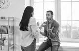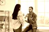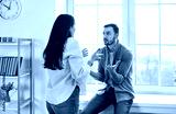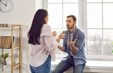 Annoyed young family couple arguing emotionally, blaming each other. Stressed irritated woman and man shouting at each other having serious relations communication problems. Couple quarreling at home