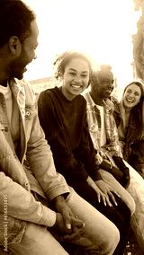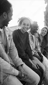 Side view of group of Erasmus friends ganging out outdoors having fun, one girl looking at camera smiling. Copy space, vertical photo.