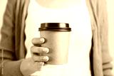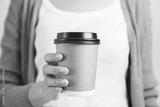 Hand holding blank kraft paper coffee cup for takeaway, delivery concept.