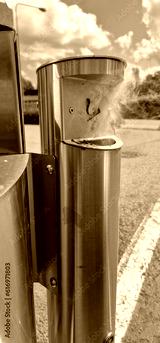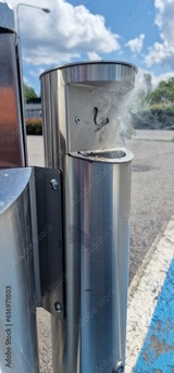Smoke rising from inside metal cigarette disposal bin caught on fire.