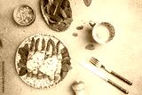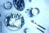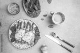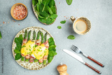 Delicious breakfast with eggs Benedict and green asparagus wrapped in grilled bacon and a cup of coffee. banner, menu, recipe place for text, top view