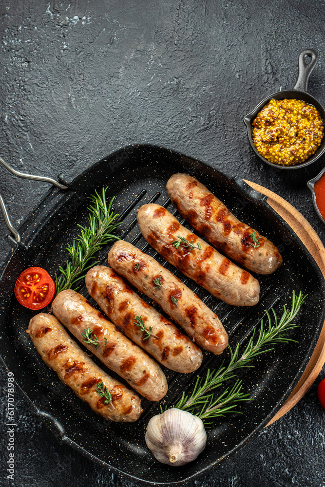Barbecue sausages with rosemary in pan. meat sausages in skins with spices, vertical image. place for text