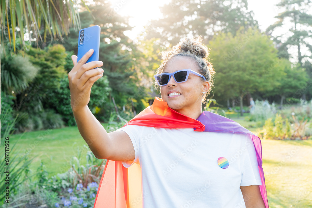 Young Latin happy woman wrapped in a rainbow flag, symbol of LGBT community, makes selfie on a mobile phone on a pride celebration in a city park. Human Rights, Equality, LGBT, Freedom and Happiness