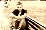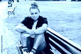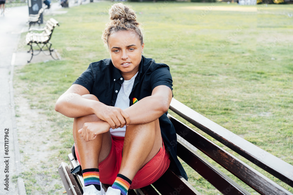 Sad frustrated lesbian woman with LGBTQ rainbow badge on t-shirt sitting on the park bench alone. Concept of loneliness, sadness and pain for homosexual discrimination. Mental crisis, depression