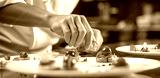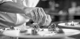Professional chef in white uniform cooking vegetarian dish. Creative preparing meal. Food prepare in process vegetarian dish by chef hand in the restaurant's kitchen.