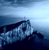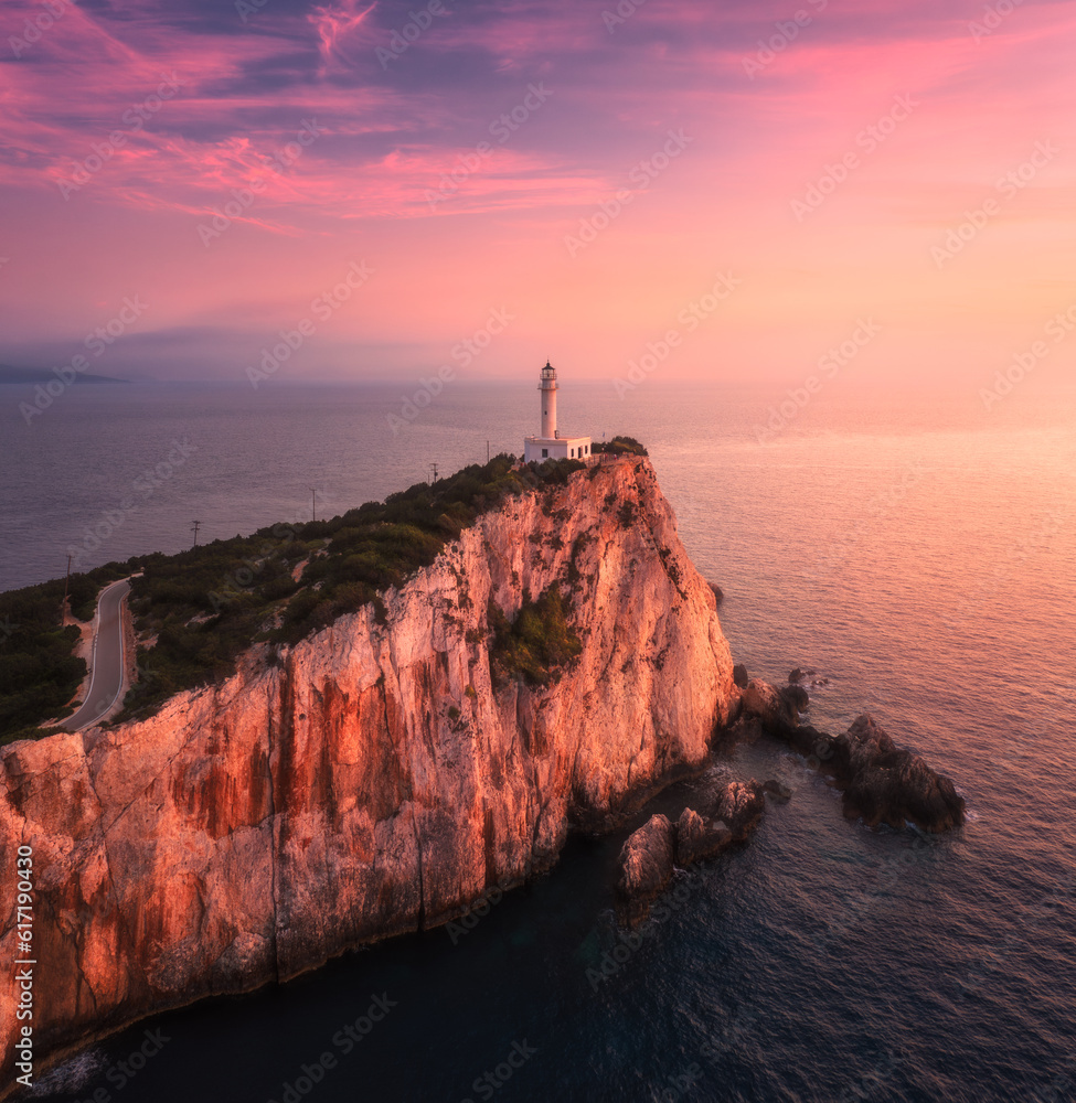 Lighthouse on the mountain peak at colorful sunset in summer. Aerial view. Beautiful lighthouse on the rock, cliffs, sea and sky with pink and purple clouds. Top view of Cape Lefkada, Greece. Beacon