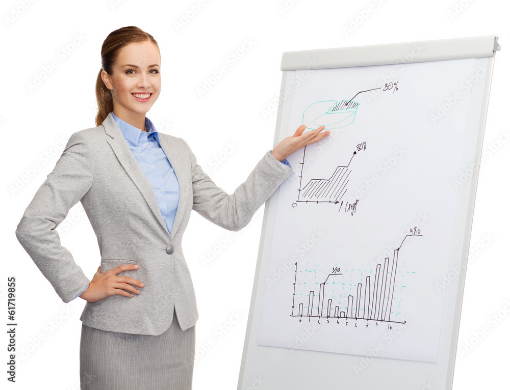 smiling businesswoman standing next to flipboard