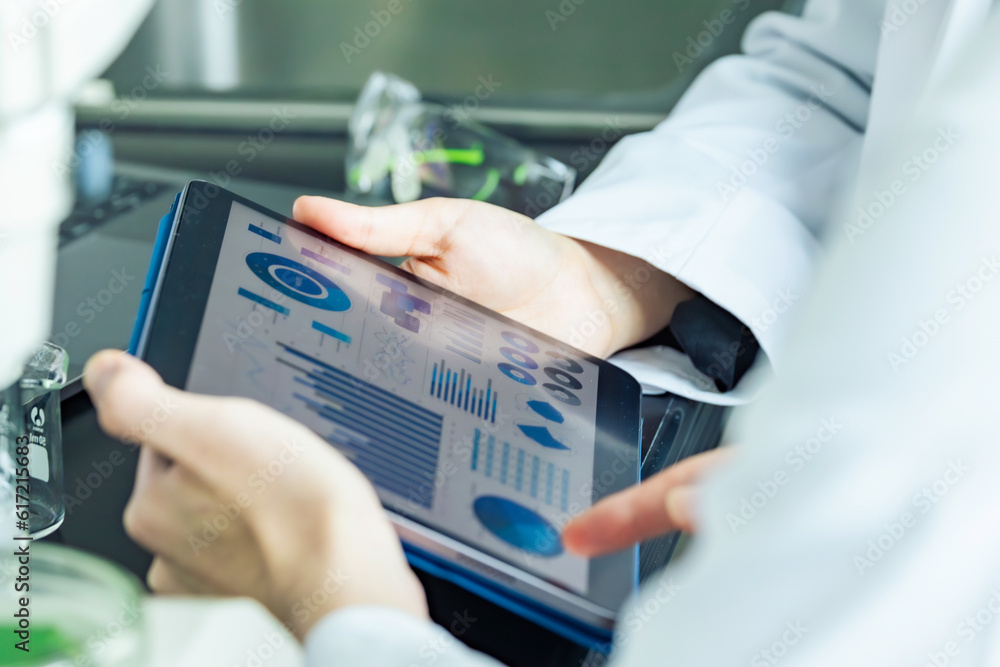 Group of researchers looking at tablet data in the lab. Research and Development.