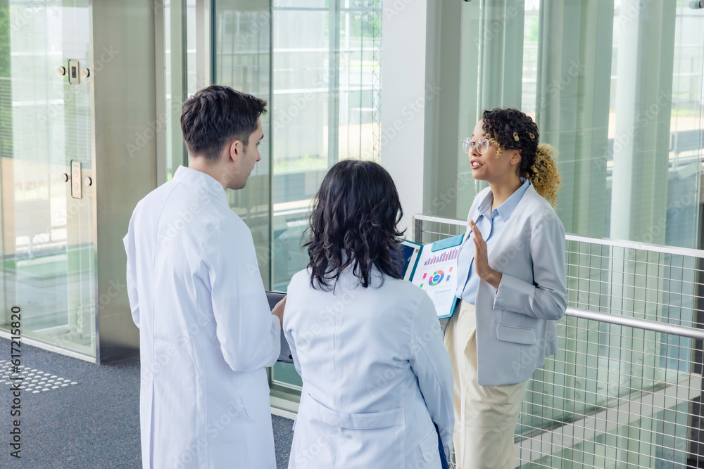 A multinational group having a conversation in the lobby. People in white coats and sales staff. High angle view.