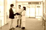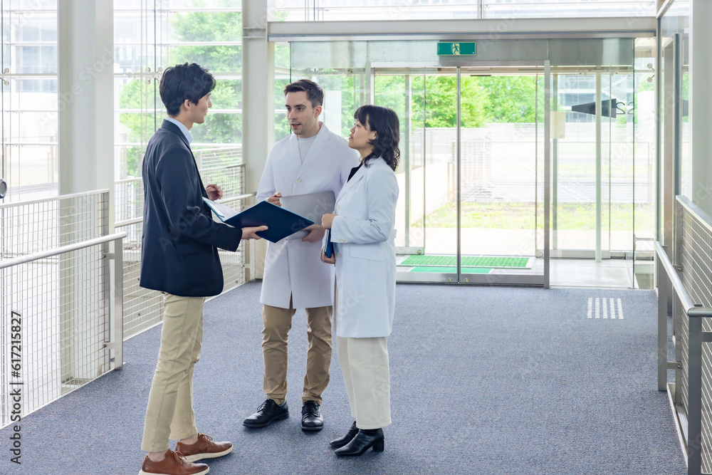 A multinational group having a conversation in the lobby. People in white coats and sales staff. High angle view.