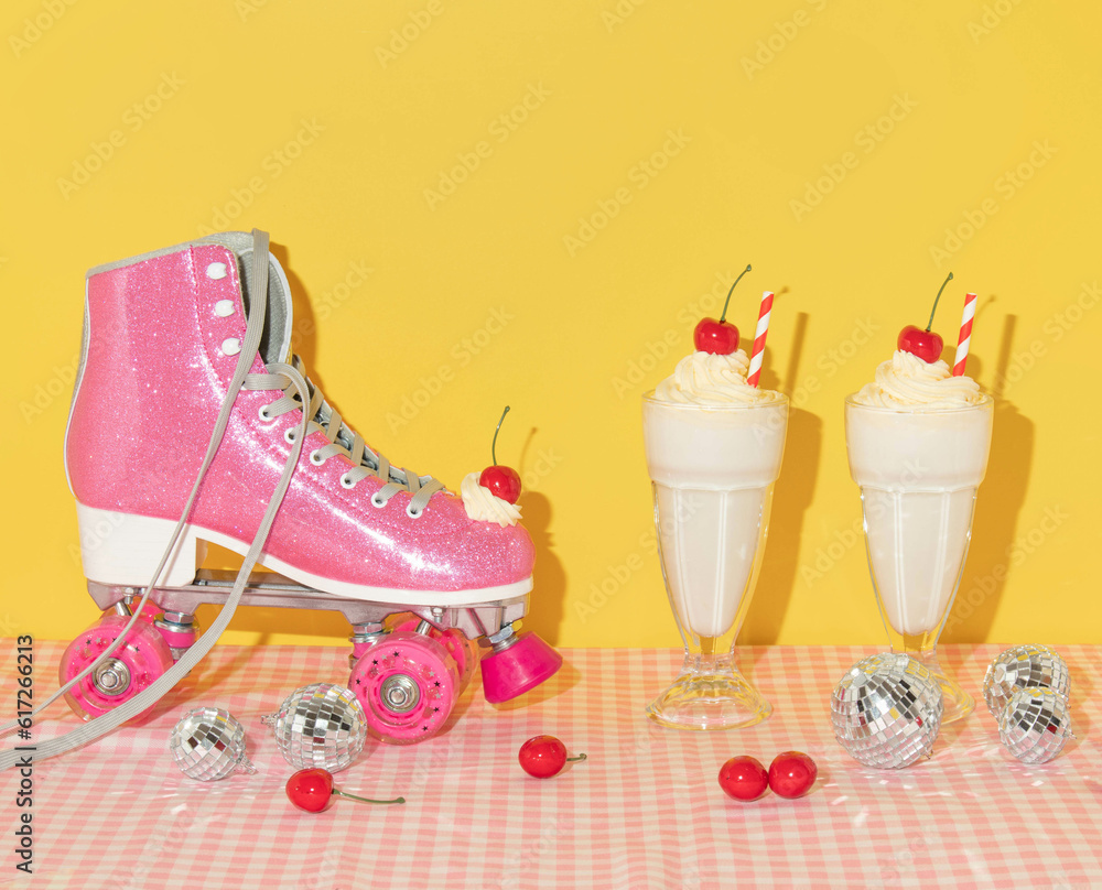 Summer creative layout with pink roller skate with whipped cream and red cherry, two milkshakes, disco balls, and cherries on pastel pink plaid and yellow background. 80s or 90s retro aesthetic