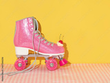 Summer creative layout with pink roller skate with whipped cream and bright red cherry on pastel pink plaid and yellow background. 80s or 90s retro aesthetic idea. Minimal summer fashion girl idea.