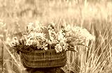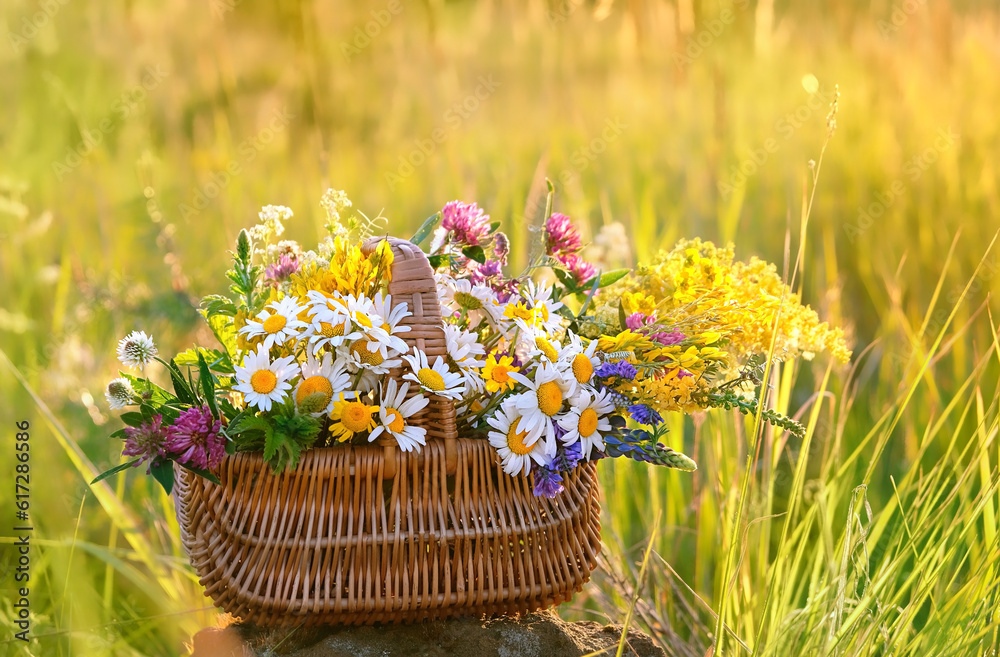 Summer background. colorful flowers and herbs in wicker basket on meadow, abstract sunny natural background. Useful medical plants harvest. beautiful image of wild nature. template for design.