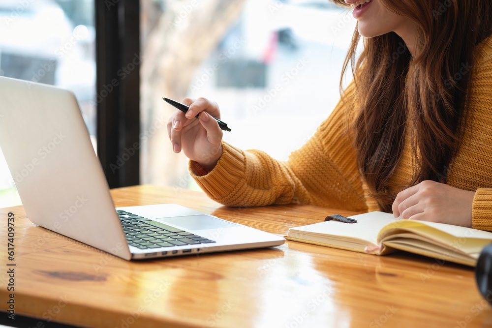 Happy latin girl college student watching distance online learning class, remote university webinar or having talk on laptop video call and use notebook to virtual meeting seminar at home or campus