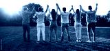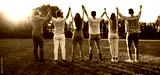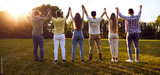 Diverse friends meet in the park. Group of multiracial young people standing in row on green lawn and holding hands up in evening sunlight. Back view, from behind. Friendship, community concept