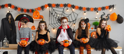 Banner with group of happy young kids at Halloween costume party. Smiling children dressed up as different spooky characters sitting in row on table holding orange trick or treat buckets with candy