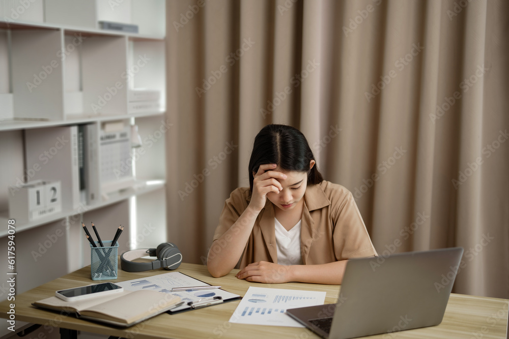 Tired asian business woman overworking and headache stressed
