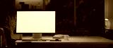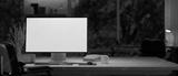 A computer mockup and decor on a wooden table in a modern dark office room at night.