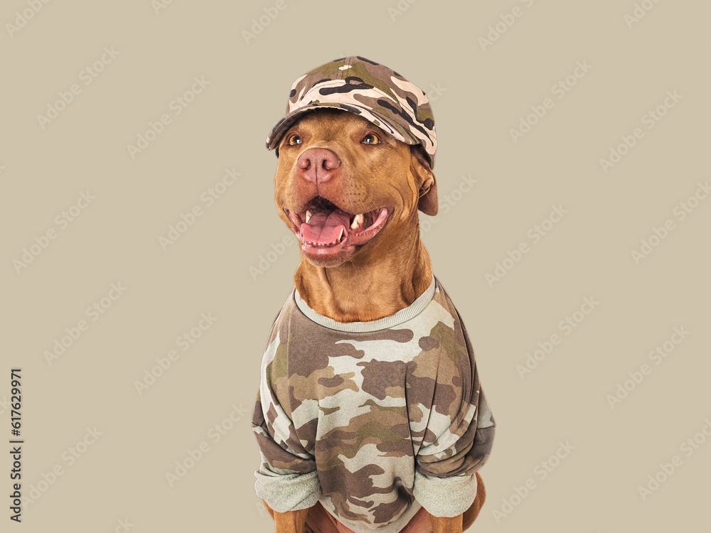 Cute brown dog, military shirt and army cap. Closeup, indoors. Studio shot. Congratulations for family, loved ones, relatives, friends and colleagues. Pets care concept