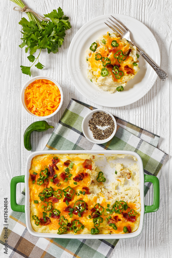 Loaded smashed potatoes with cheese, bacon, cream