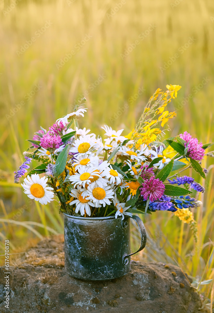Summer background. flowers and herbs in old metal cup on meadow, sunny natural background. Useful medicinal plants harvest for treatment products. beautiful image of wild nature. copy space