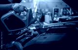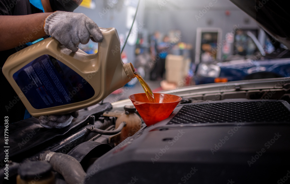 Car mechanic open car hood repairs system checking oil motor level for refill super machine oil and clean in car garage service.