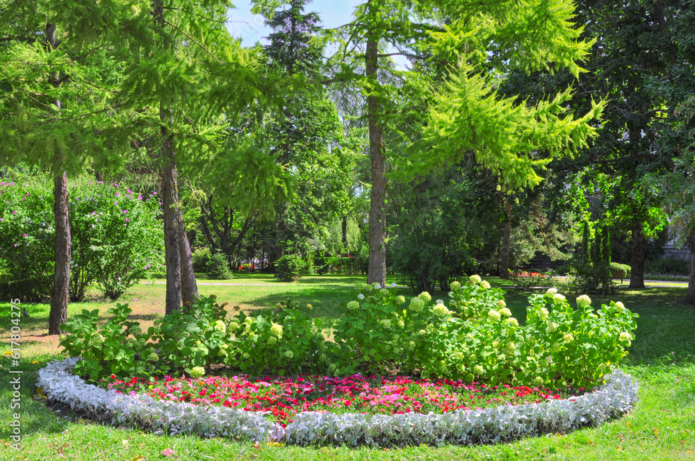 Beautiful bright flower garden with different colors among coniferous trees in the city botanical garden