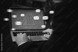 Man using laptop computer with hacker alarm protecting data from cybercrime in the digital age. Internet security and privacy defending against data theft and email breach.
