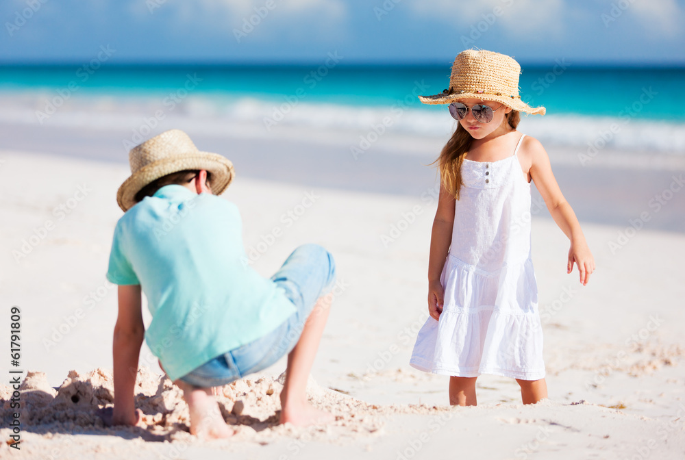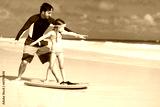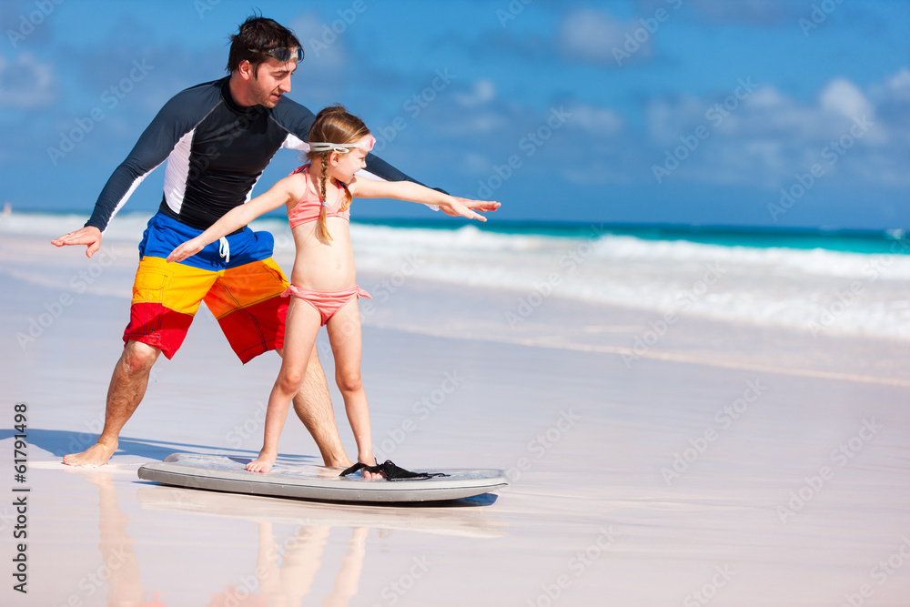 Father and daughter practicing surfing