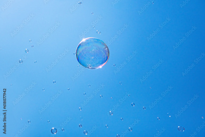 Soap bubbles in the blue sky. Beautifully iridescent balls of soap foam in the air