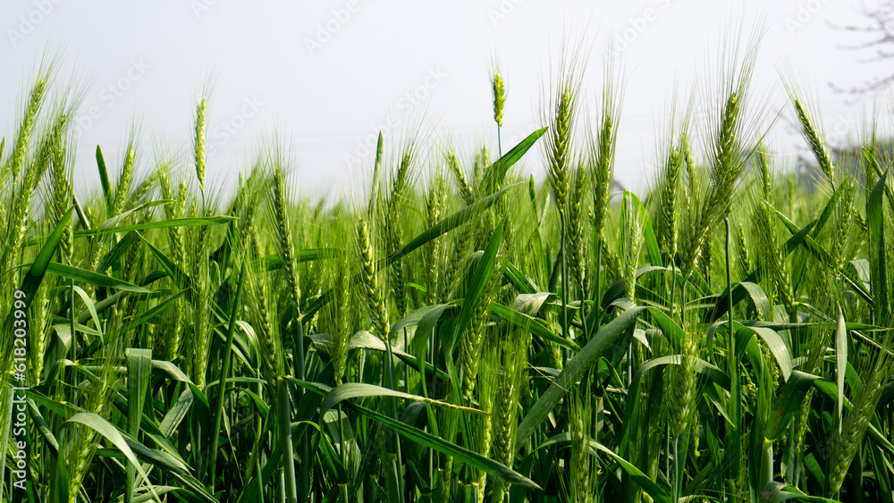 Green wheat field landscape. A vast field filled with green grains of wheat. Closeup image of large wheat grain. Bangladesh is an agricultural country in South Asia.