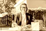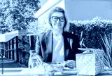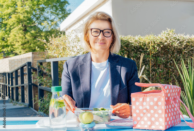 Portrait of smiling middle-aged business woman having lunch at the park outdoor cafe, picnic area during her break. Take away balanced diet lunch box with salad. Healthy eating habits and well-being