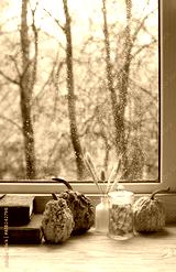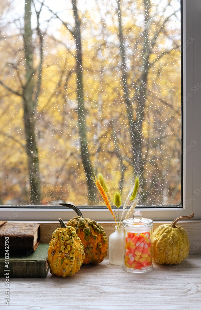 autumn decor. pumpkins, books, candy corn in jar on windowsill. rainy window abstract background. autumn seasonal home cozy composition. fall time concept
