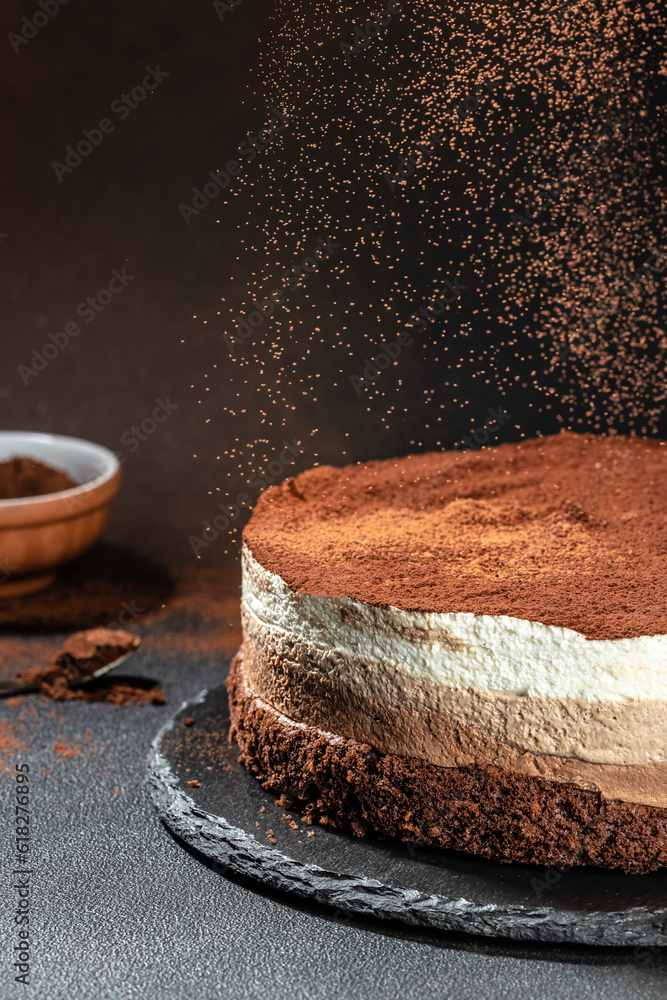 chocolates cake, mousse cake on a dark background. Food recipe background. Close up