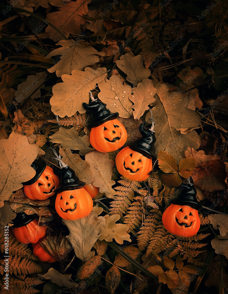jack-o' lantern garland on autumn leaves, abstract dark forest natural background. symbol of Halloween holiday, Samhain sabbat. festive autumn season. top view.