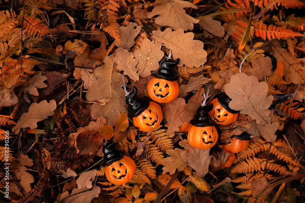 jack-o' lantern garland on autumn leaves, abstract dark forest natural background. symbol of Halloween holiday, Samhain sabbat. festive autumn season. flat lay