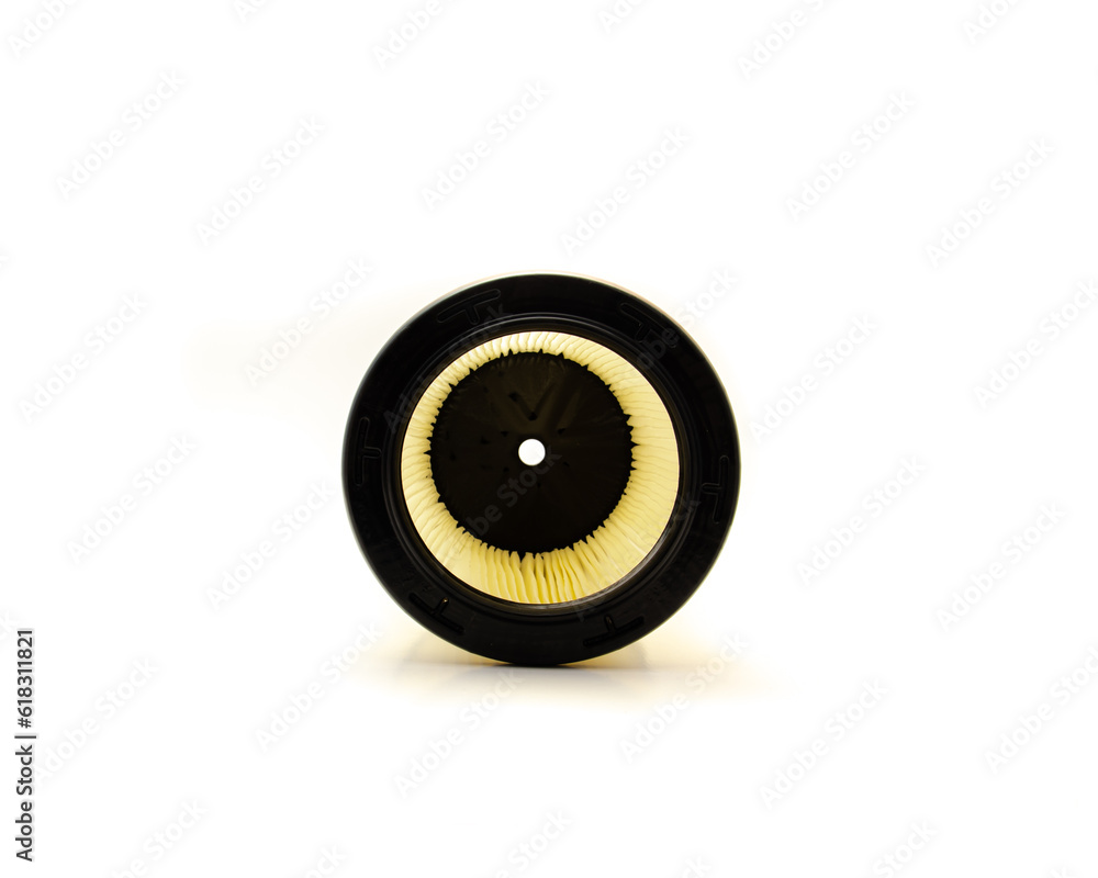 Inside the tube of brand-new shop vacuum filter made of 1-layer standard pleated paper, filtration system captures dry pickup of dirt, sawdust, debris isolated on white background