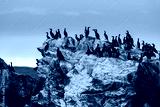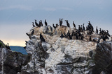 Flock of great cormorants sitting on a rock in Kamøyvær in Northern Norway near North Cape on late summer evening in August 2022 with rocks showning signs of discoloration due to bird poo.