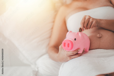 Concept Motherhood and Pregnant, Money saving for pregnancy, finance, investment, fund and life insurance. Pregnant woman drop money coin into piggy bank for saving money to her newborn baby.