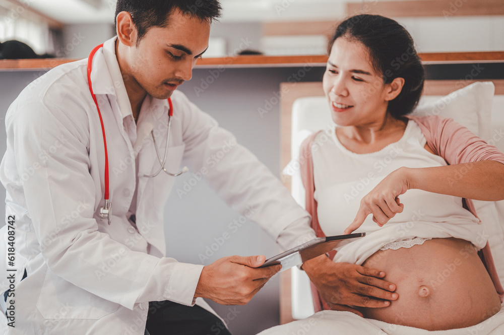 Concept Motherhood and Pregnant, Prenatal care and pregnancy. Male doctor showing digital tablet with baby ultrasound picture on tablet to pregnant woman sitting on the bed.