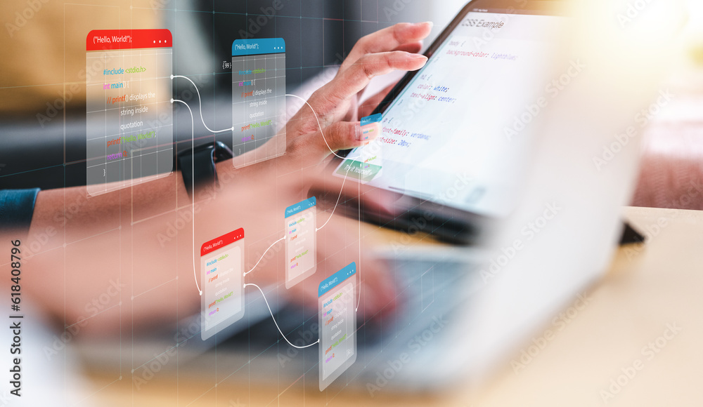 Concept programmer, Developer programming and coding technology, Hand Close up asianwoman using laptop and tablet artificial coding business data analytics programming.