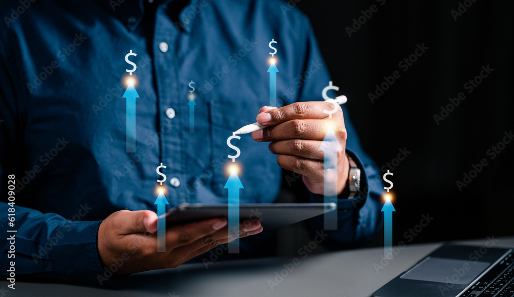 Data analysis Corporate strategy for finance, stock market trading. Businessman holding pen check money dollar and working on tablet. Financial graph with group of up trend arrow and dollar sign