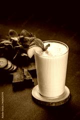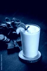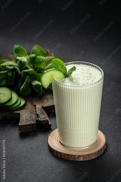 Turkish Drink Ayran or Kefir with fresh herbs in a glass on a dark background, clean eating for weight loss. place for text